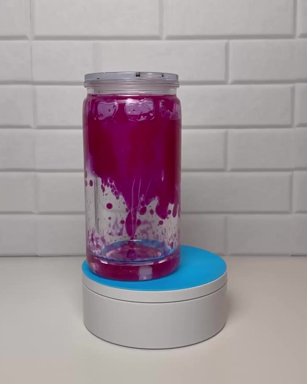 Im Zwischenraum des Lavabechers entsteht ein spannender Tropfeffekt: Die Farbe läuft langsam nach unten, sammelt sich, verteilt sich wieder - und beginnt bei der nächsten Bewegung erneut ihr kleines Schauspiel.